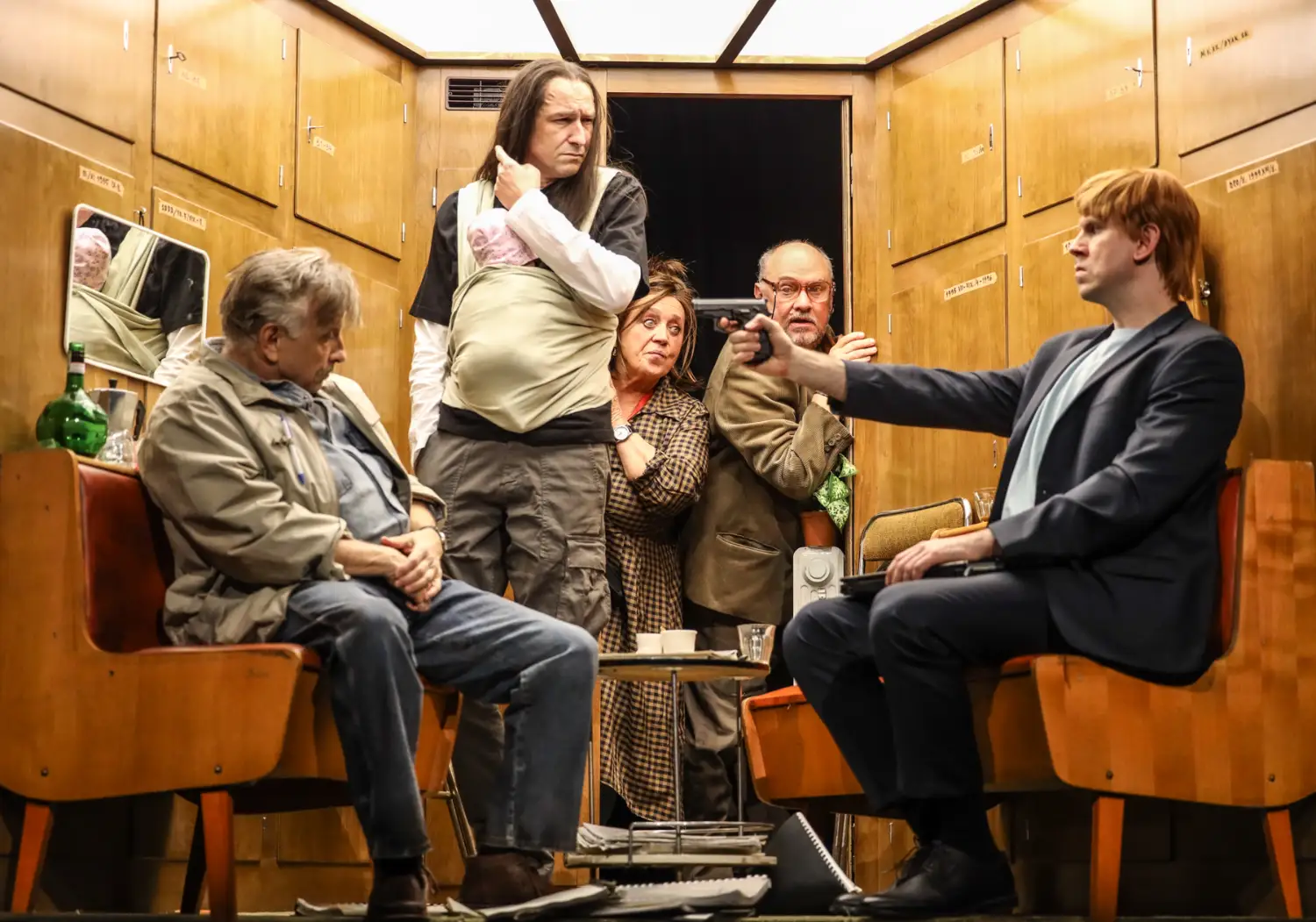 Díszletét tekintve igen minimalista, szinte mindegyik szekcióhoz (a másodikat leszámítva) egy egyszerű, de annál ötletesebb díszlet tartozik, melyek közül személyes kedvencem a nyitóblokk berendezése, a 4:3 képarányt idéző kicsiny és szűkös szoba volt, melybe megpróbáltak minél több szereplőt bepréselni, ugyanakkor az elrugaszkodott és nyitottabb gondolatmenetű jeleneteknél nem féltek ebből a dobozból kiugrani sem. Ezek a díszletek továbbá szerényen, spotlámpa-szerű fényekkel voltak megvilágítva, amely kifejezetten a díszletre és a színészekre irányult, ezzel egy erős kontrasztot keltve az üresen és látszón hagyott, így szinte a semmibe vesző színpadi háttér és a fókuszban lévő előtér között.